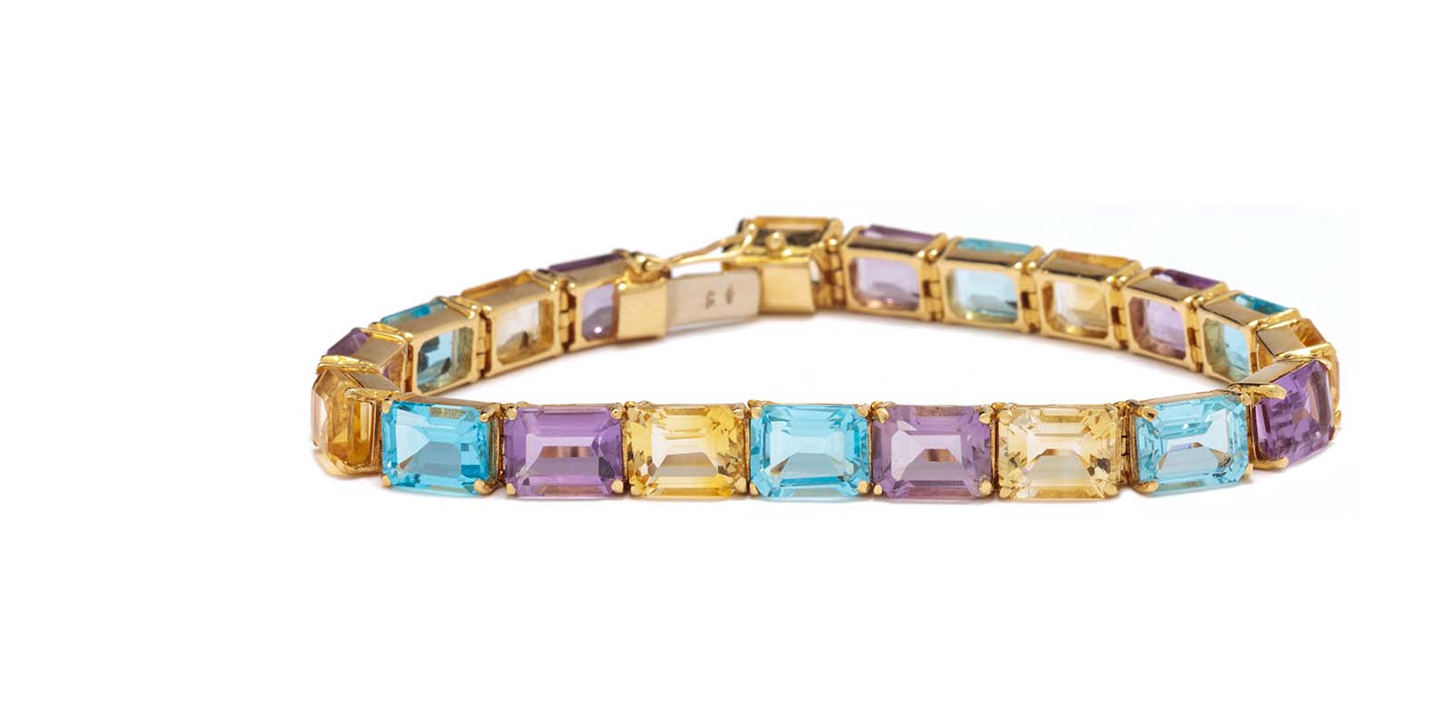Bunt schillerndes Farbstein-Armband mit Amethysten, Citrinen und Saphiren auf 585er Gelbgold