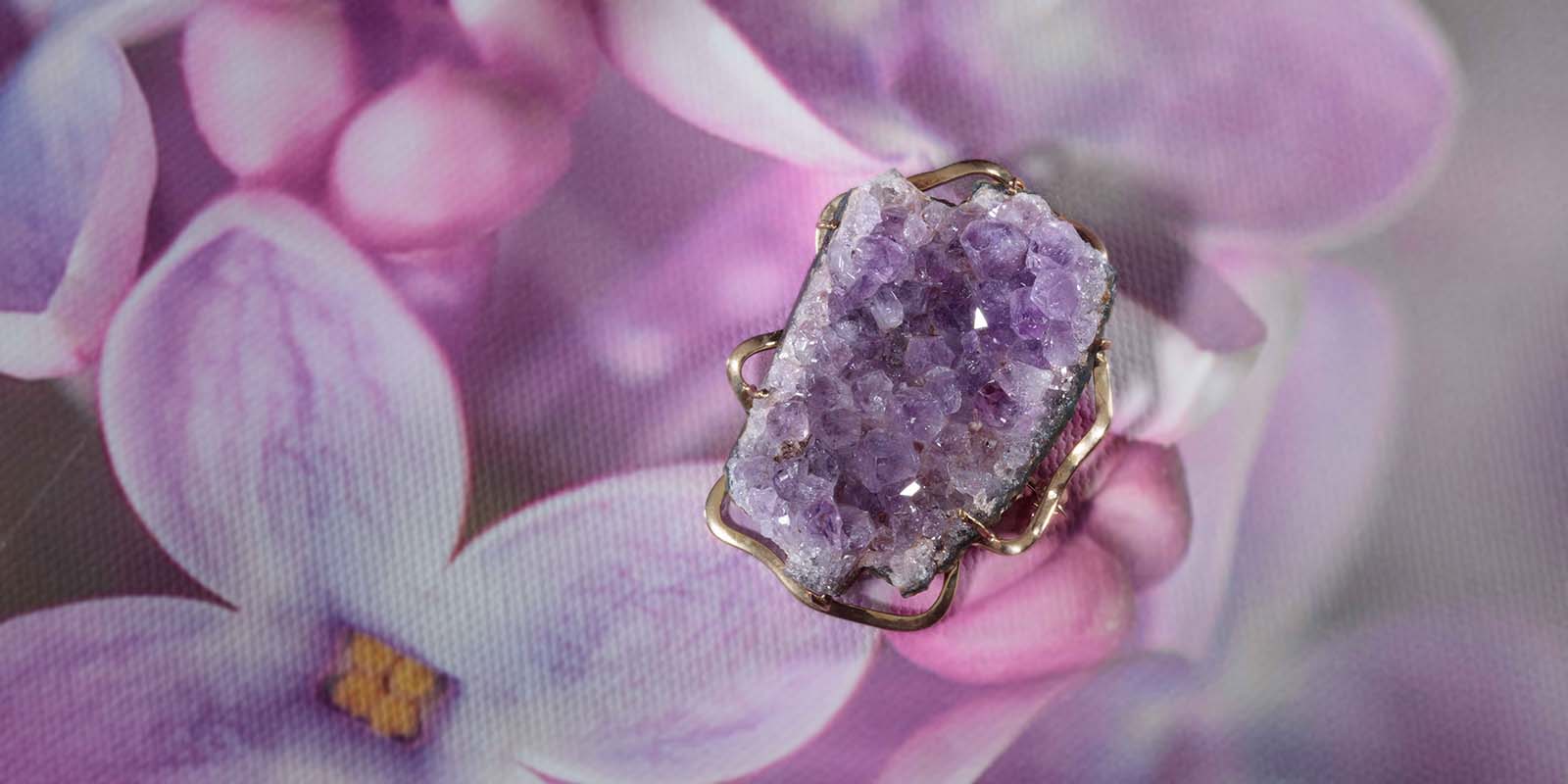 Eine Brosche aus 333er Gelbgold mit naturbelassenen Amethyst-Kristallen