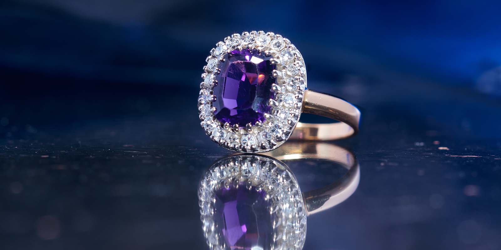 Ein tief violetter Amethyst ziert den 585er Gelbgold-Ring, umgeben von 20 Diamanten