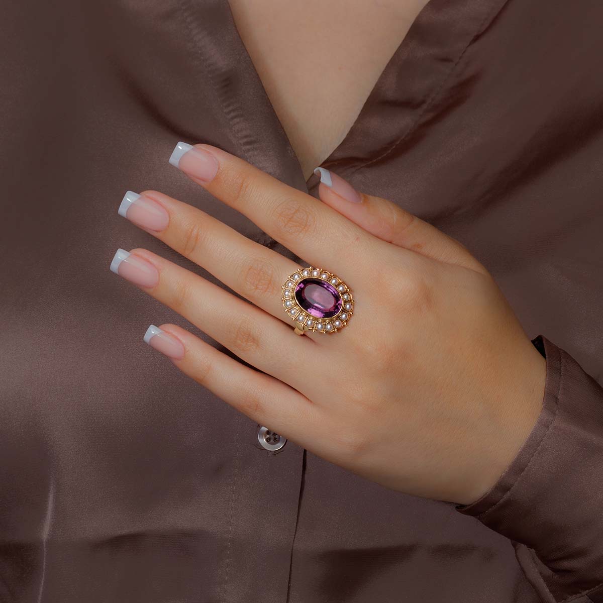 Ein herrlicher Amethyst, eingerahmt von Halbperlen auf einem Ring aus 585er Gelbgold