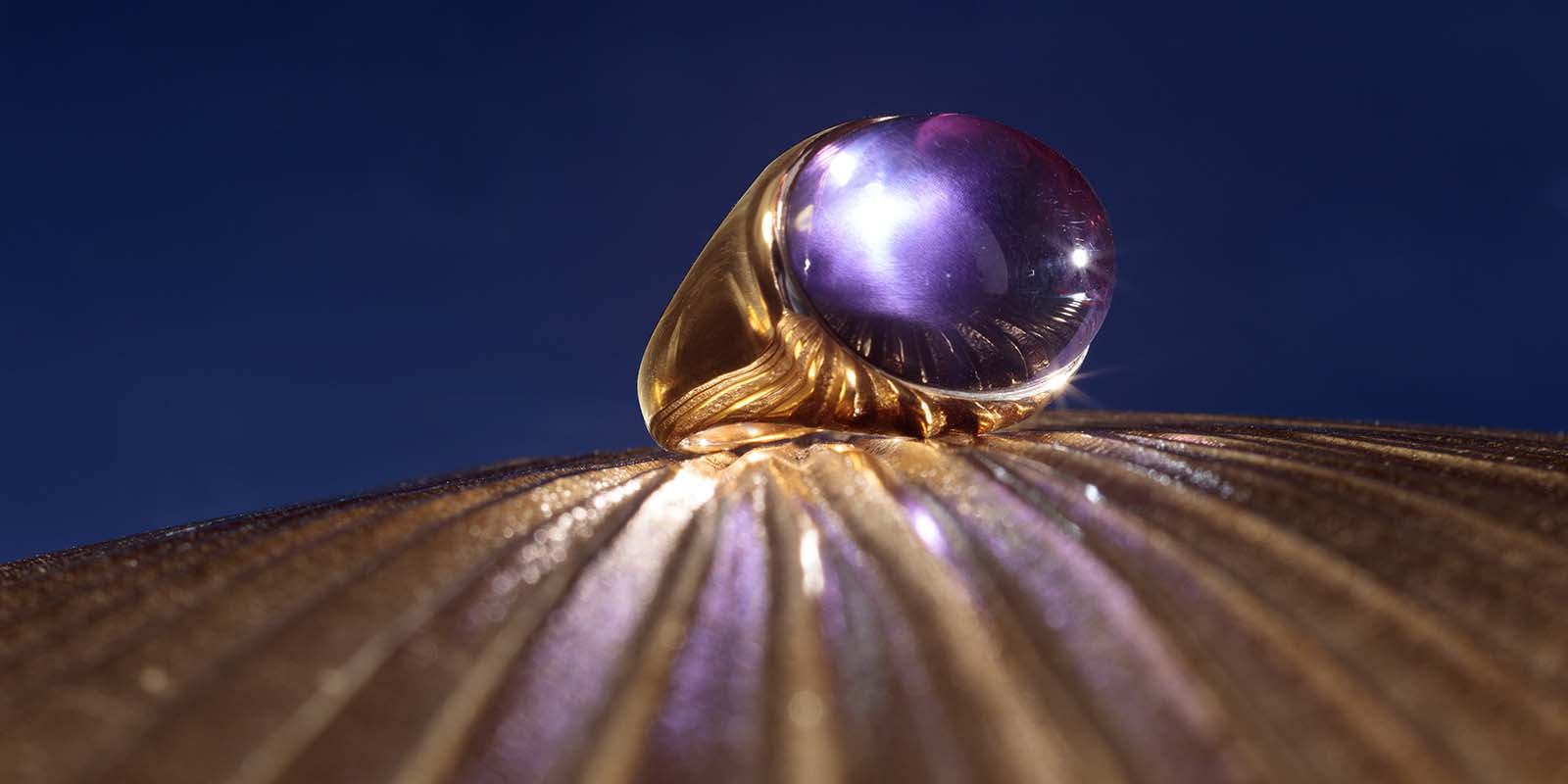 Wie ein Tropfen kostbaren Weins lockt ein großer Amethyst auf diesem Ring aus 750er Gelbgold