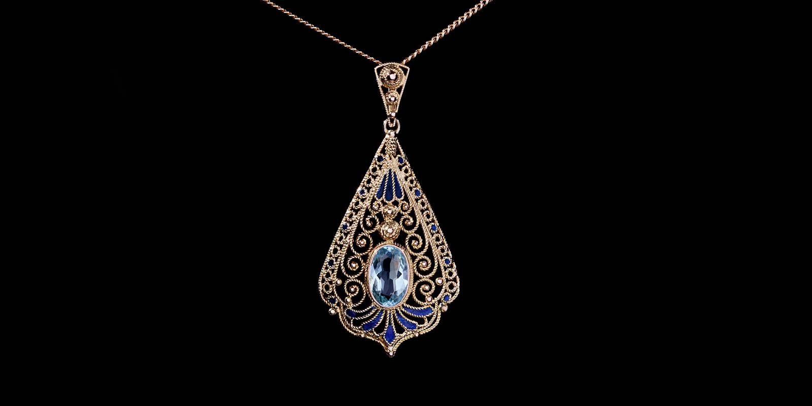 Ein traumhaftes Amulett mit Aquamarin und Emaille-Verzierungen an einer Halskette aus 585er Gelbgold