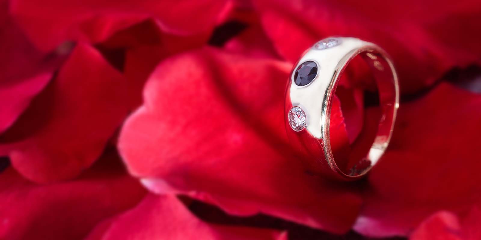 Ein Bandring aus 585er Gelbgold mit zwei Brillanten und einem dunklen Saphir