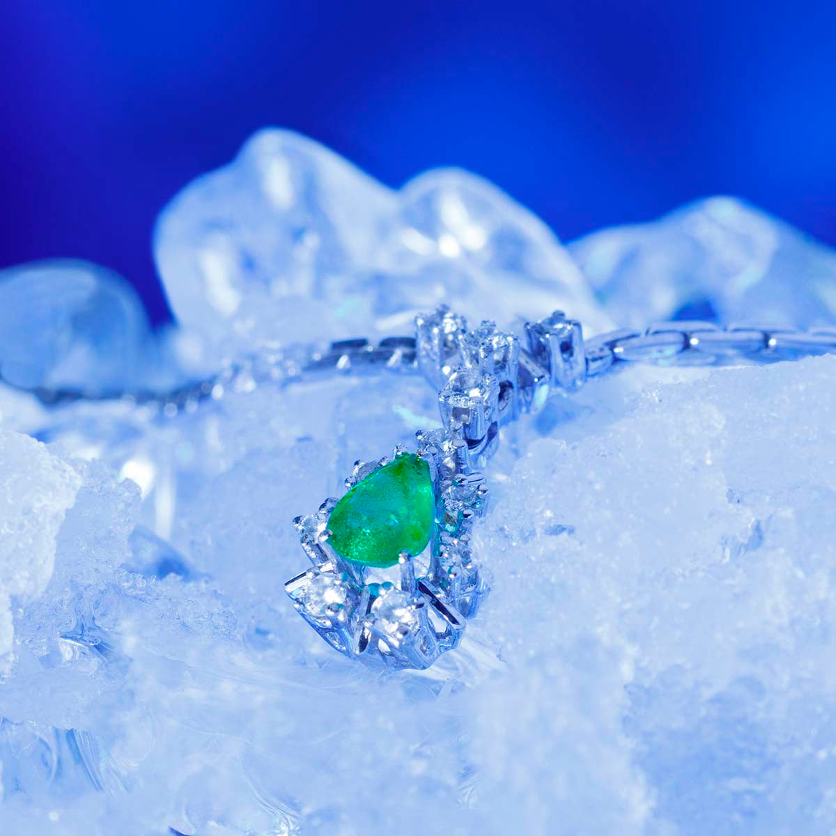 Ein prachtvolles Collier aus 750er Weißgold trägt einen Smaragd und elf Diamanten
