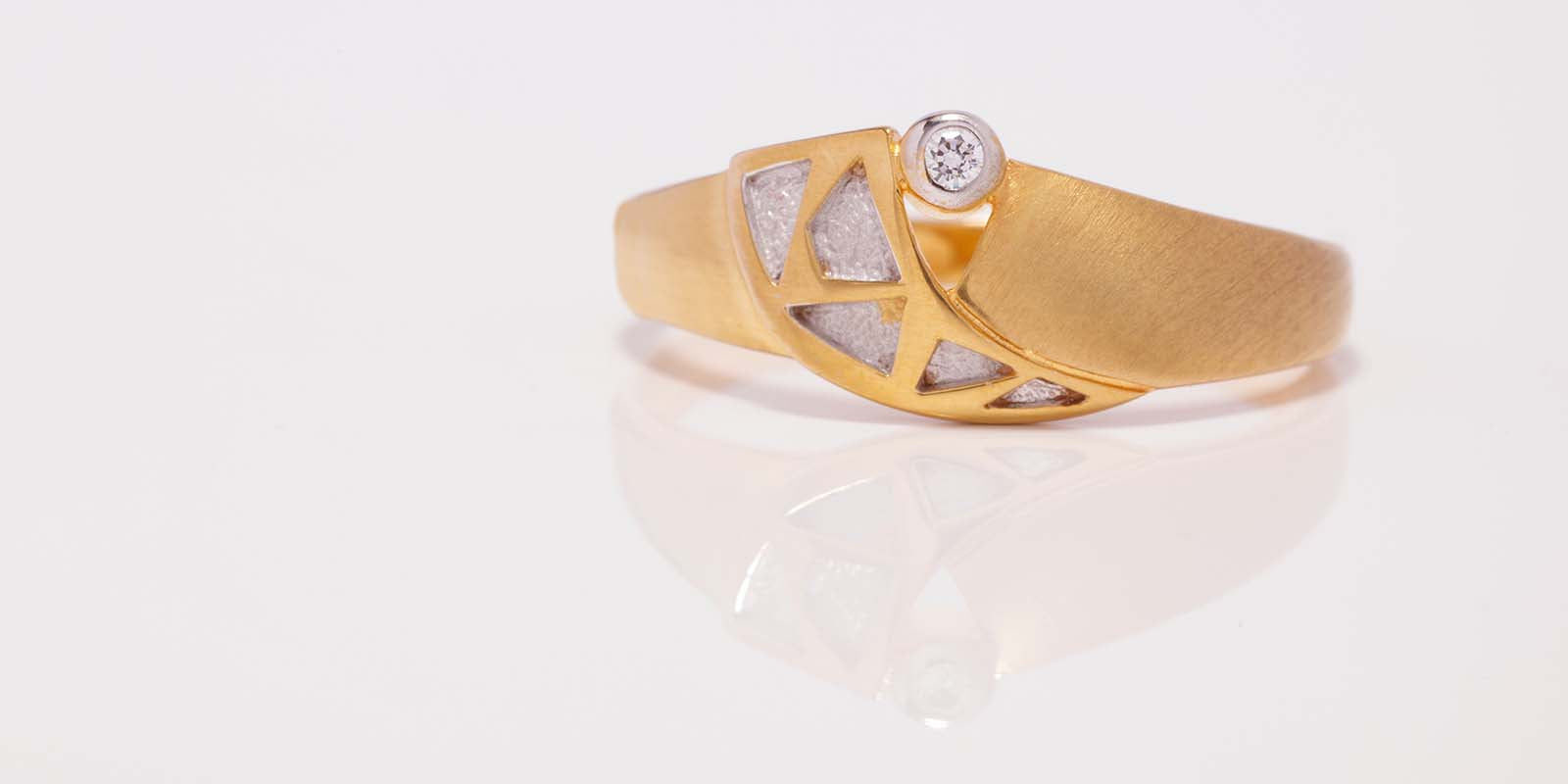 Email-Elemente und Zirkonia kommen auf einem faszinierenden Ring aus 375er Gelbgold zusammen