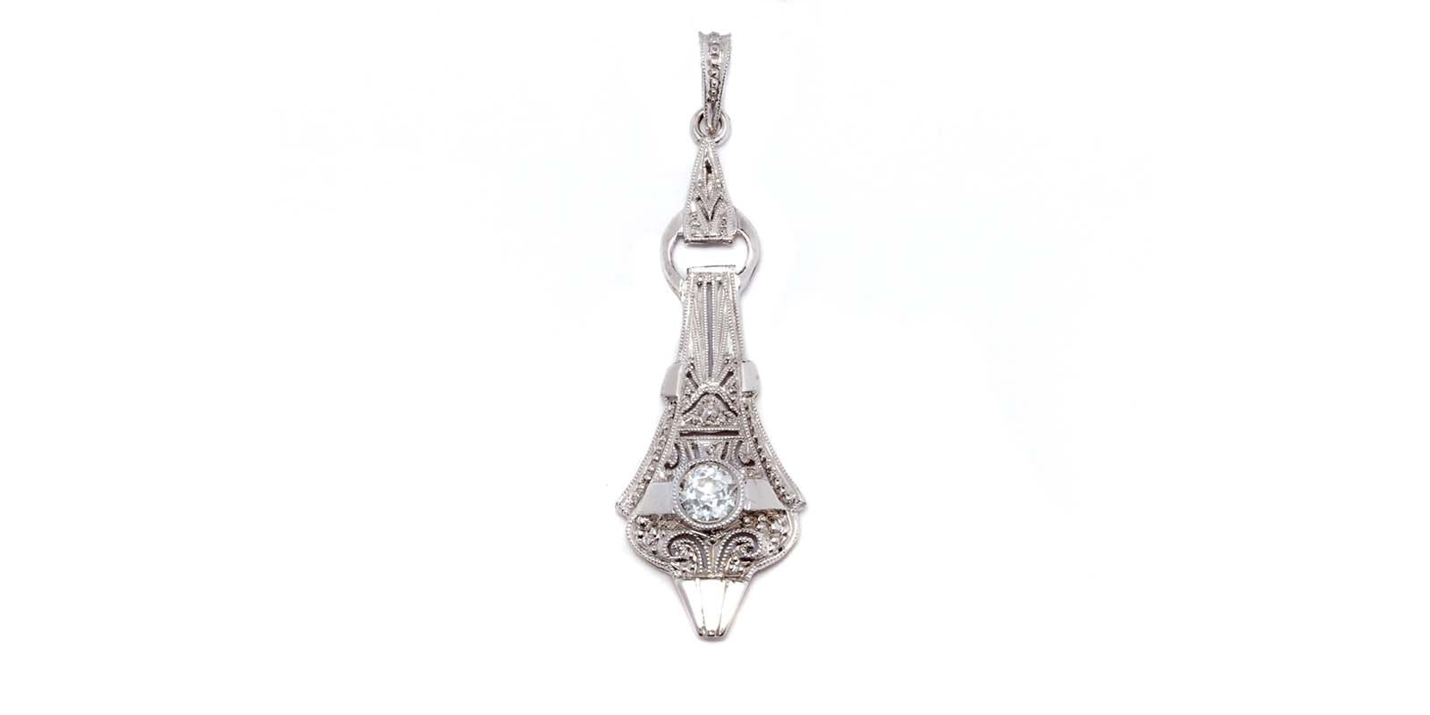Die Zopfkette aus 585er Weißgold trägt einen Anhänger mit einem Diamanten im Altschliff