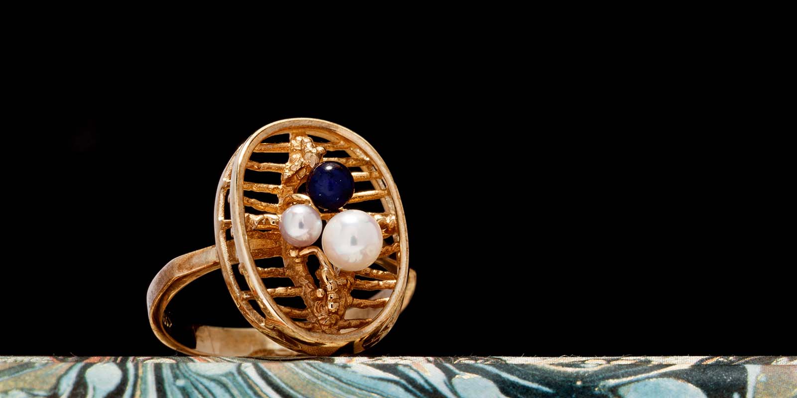 Korbartig gestalteter Ring aus 333er Gelbgold mit kostbarem Besatz aus hellen und dunklen Zuchtperlen