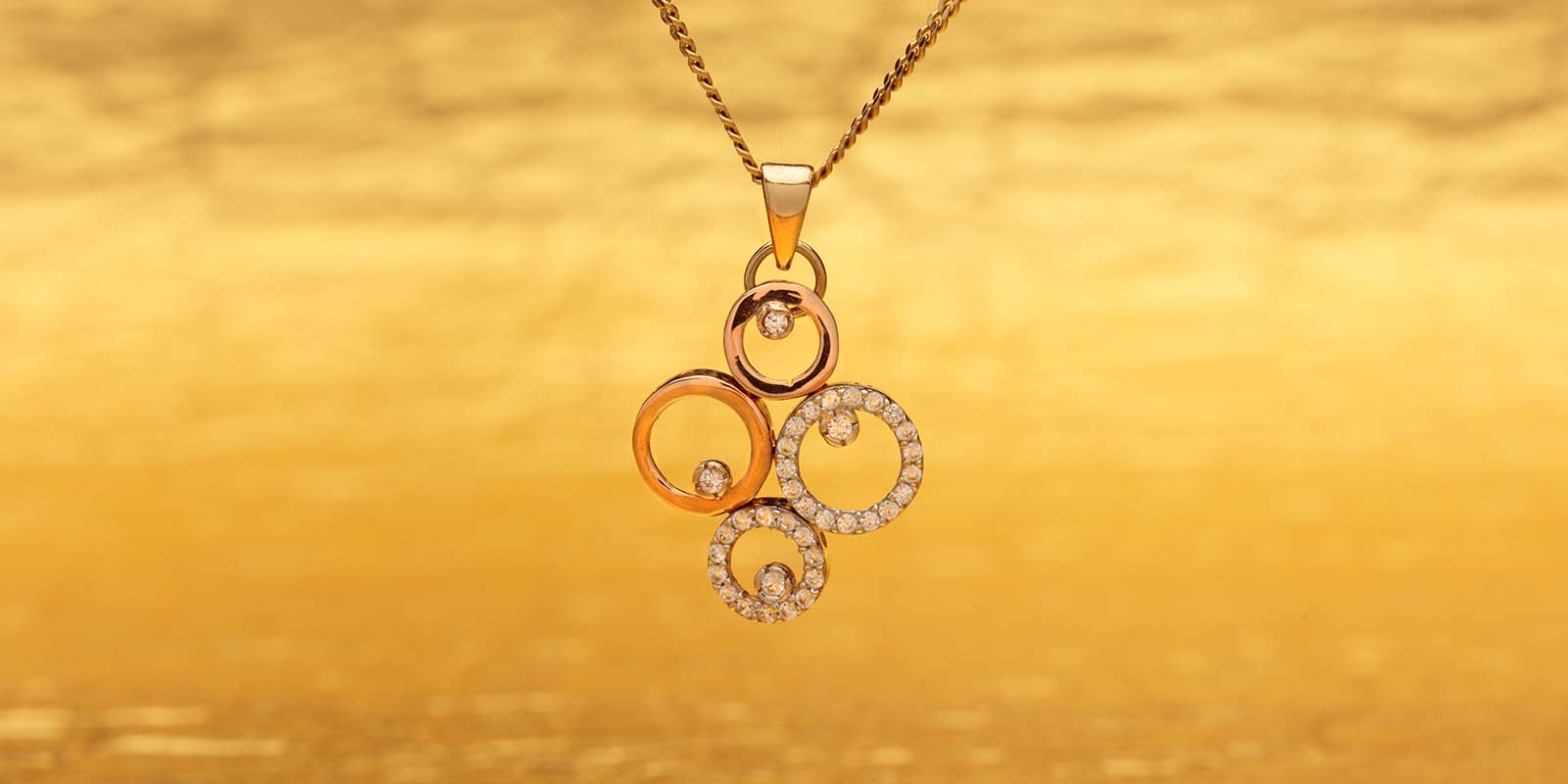 Funkelnde Kreise aus 750er Gelbgold und Rotgold formen mit 37 Brillanten einen fantastischen Anhänger