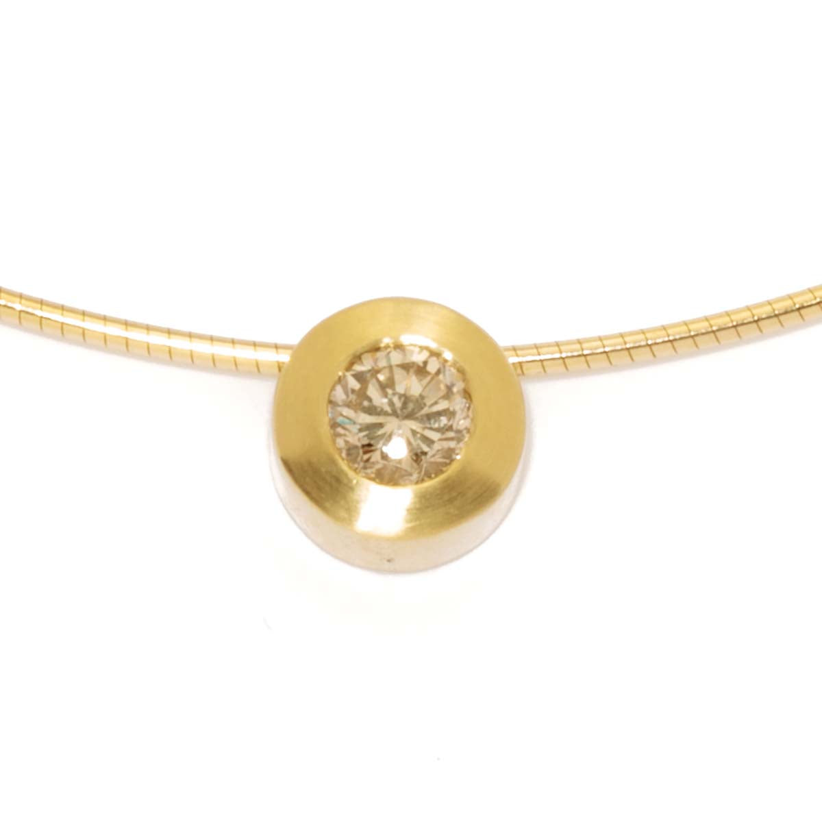 Auf unseren Bildern ist der Brillant-Anhänger an einem goldenen Halsreif zu sehen. Er kann natürlich ebenso schön an einer eleganten Halskette getragen werden. Da der Anhänger über eine durchlaufende Öse verfügt, sieht es aus, als würde er auf seiner Kette schweben.