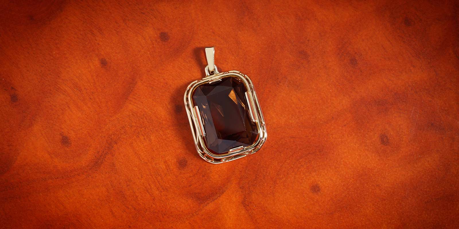 Farbstein mit Brauntönen auf einem Anhänger aus 585er Gelbgold