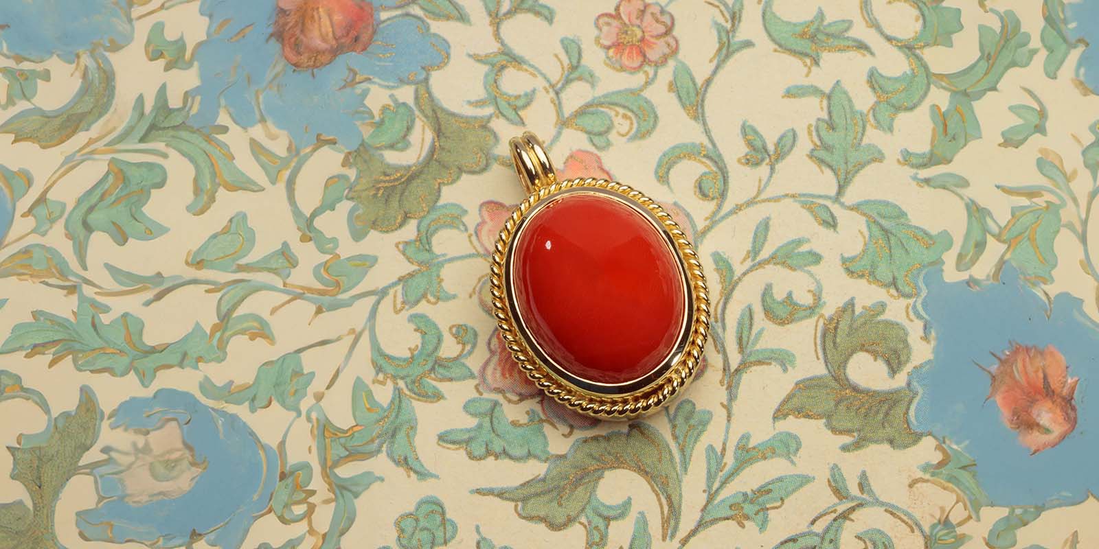 Eine herrliche, rote Koralle auf einem Anhänger aus 750er Gelbgold