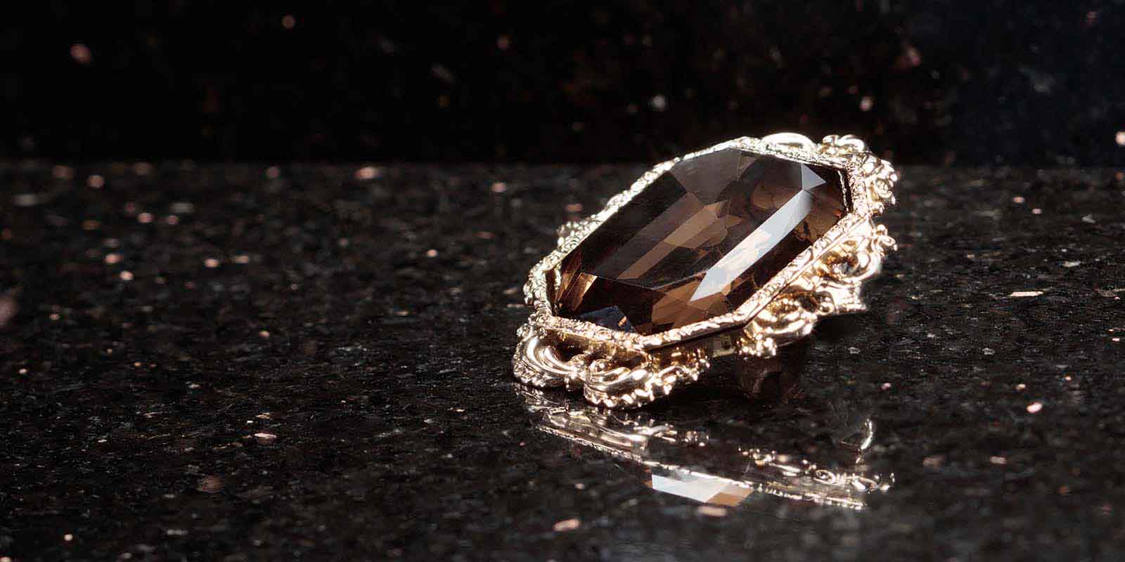 Facettiert geschliffener Rauchquarz auf einem Anhänger aus 585er Gelbgold