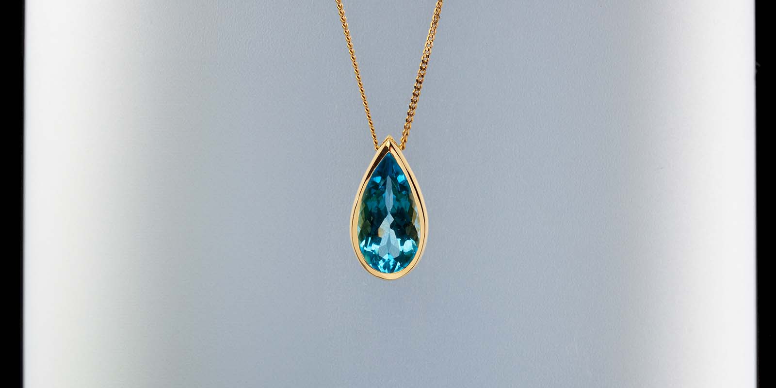 Ein tropfenförmiger, facettiert geschliffener Blautopas funkelt auf diesem Anhänger in einer Zargenfassung aus 750er Gelbgold. Der warme Ton des Goldes kontrastiert hervorragend mit dem Blau des Topases, dessen Facetten ein Lichtspiel aus unzähligen Schattierungen erzeugen.
