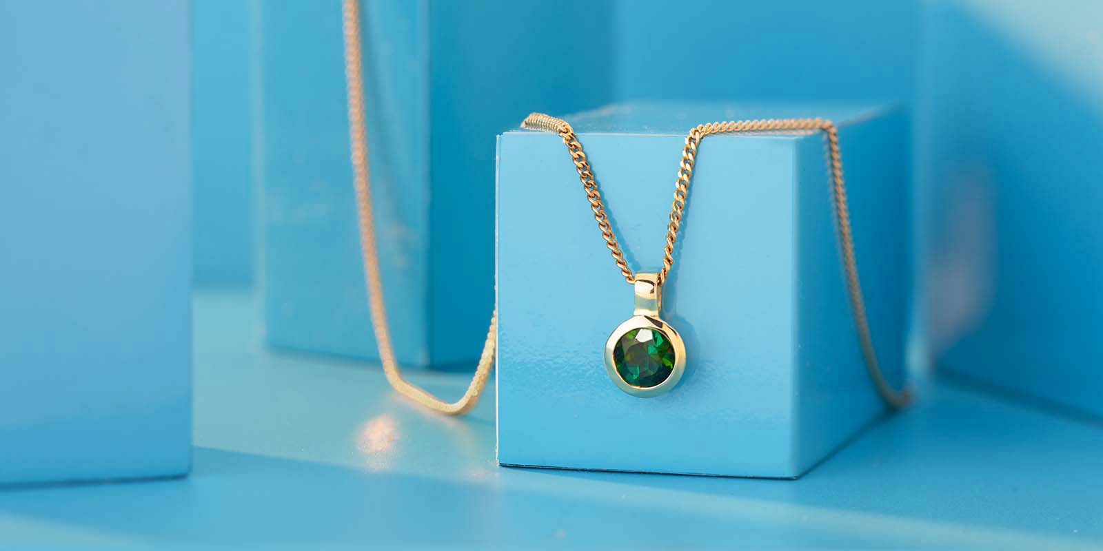 Ein zierlicher Anhänger aus 585er Gelbgold, mit grünem Turmalin und einer eleganten Flachpanzerkette