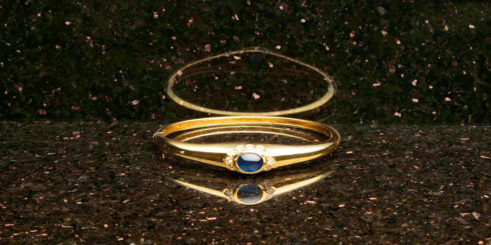 Die Krone des Armreifs ist verdickt, um neben dem prachtvollen Saphir Platz für die zwölf Diamanten zu schaffen, welche den Edelstein wie funkelnde Gestirne umringen. Die Diamanten sind als Brillanten geschliffen und besitzen zusammen ca. 0,6 Karat. Ihr weißes Glitzern hebt den angenehmen Kontrast zwischen Saphir und Gelbgold zusätzlich hervor. Der Armreif lässt sich über ein Scharnier aufklappen und mithilfe eines Steckverschlusses sicher verschließen.