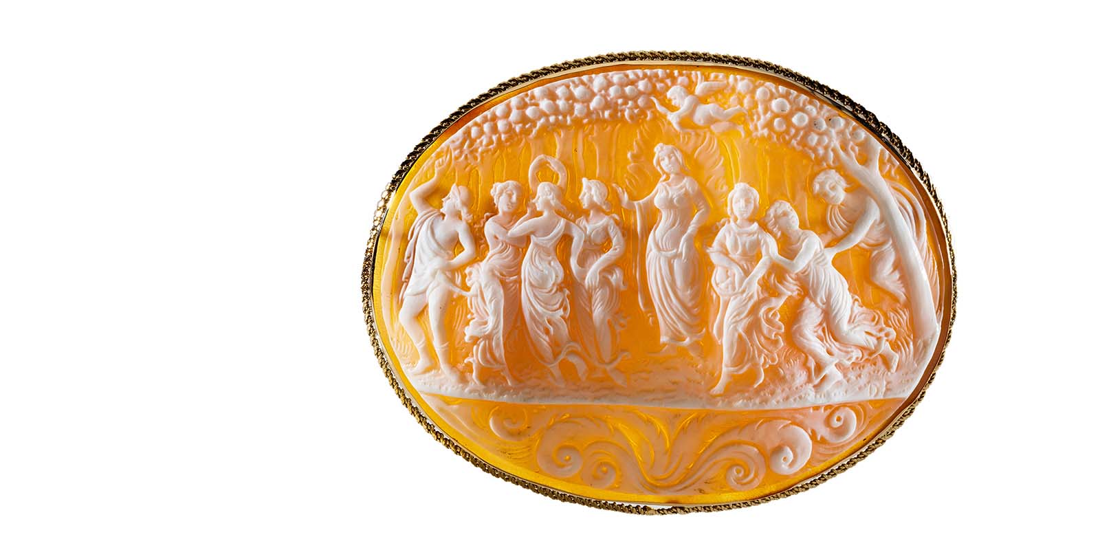 Ovale Brosche aus 750er Gelbgold mit kunstvoll geschnitzter Waldszene aus Muschelkalk