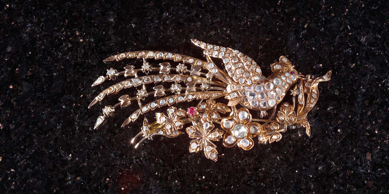 Eine liebevoll gestaltete, antike Fasanen-Brosche aus 585er Rotgold mit 144 Diamanten und zwei Rubinen