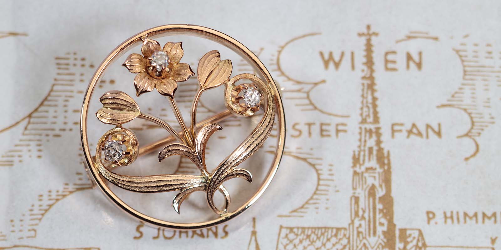 Eine Brosche mit drei Diamanten auf einem Blumengesteck aus 585er Rotgold