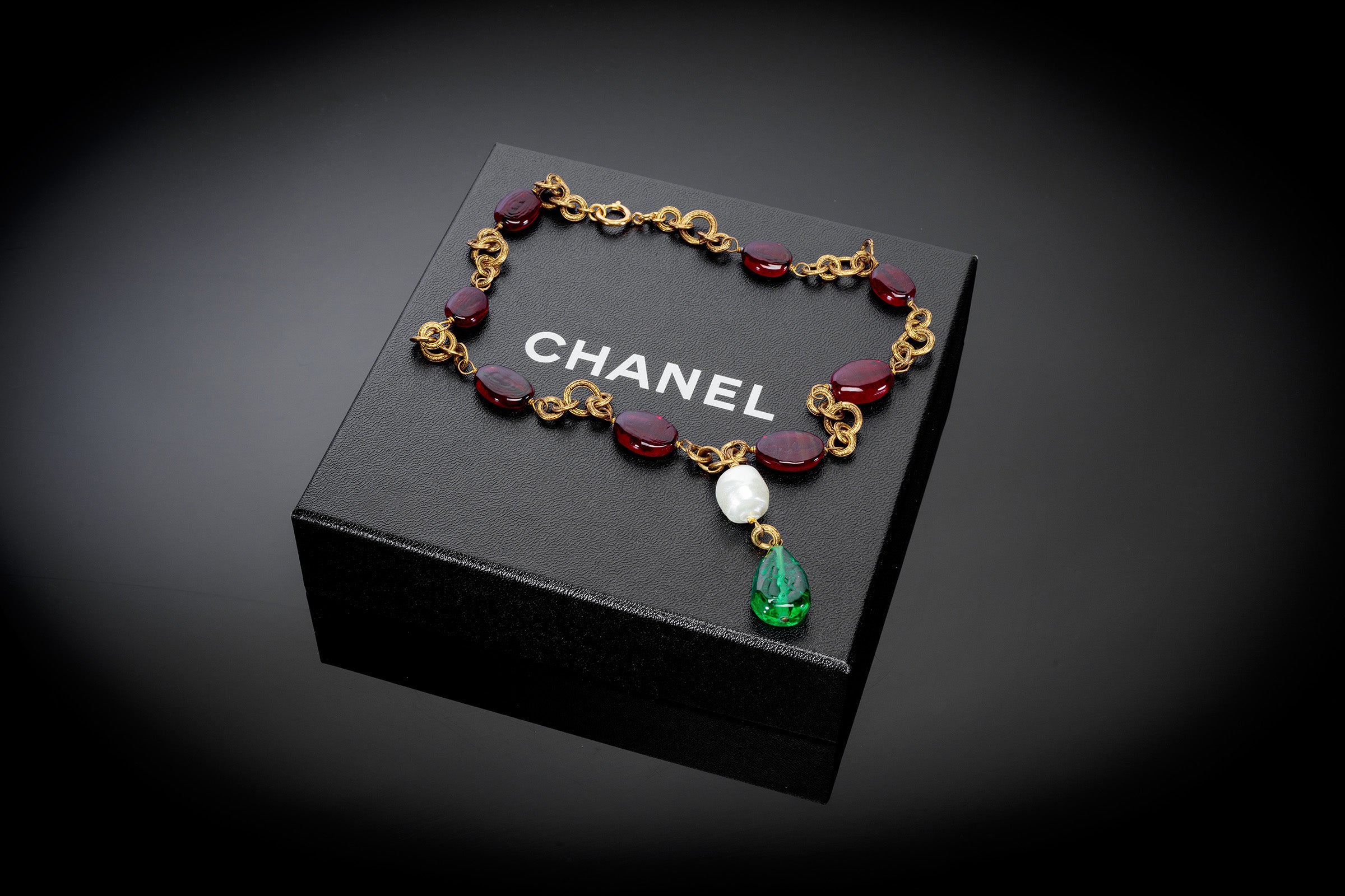 Ein grüner Kunststein und eine Kunstperle als Anhänger an einer Messingkette mit roten Synthesen