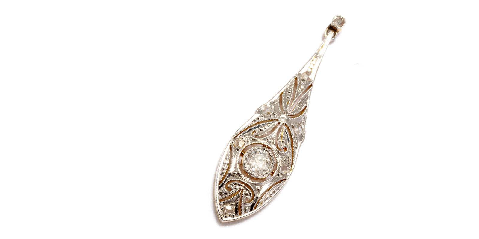 Ein tropfenförmiger Anhänger mit funkelndem Diamantbesatz an einer feinen Erbskette aus 750er Weißgold