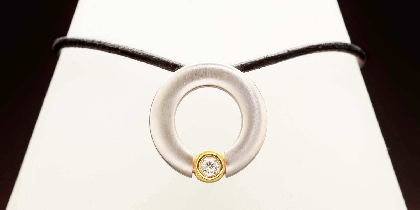 Platin, Gold und Diamant in einem Anhänger am Lederband