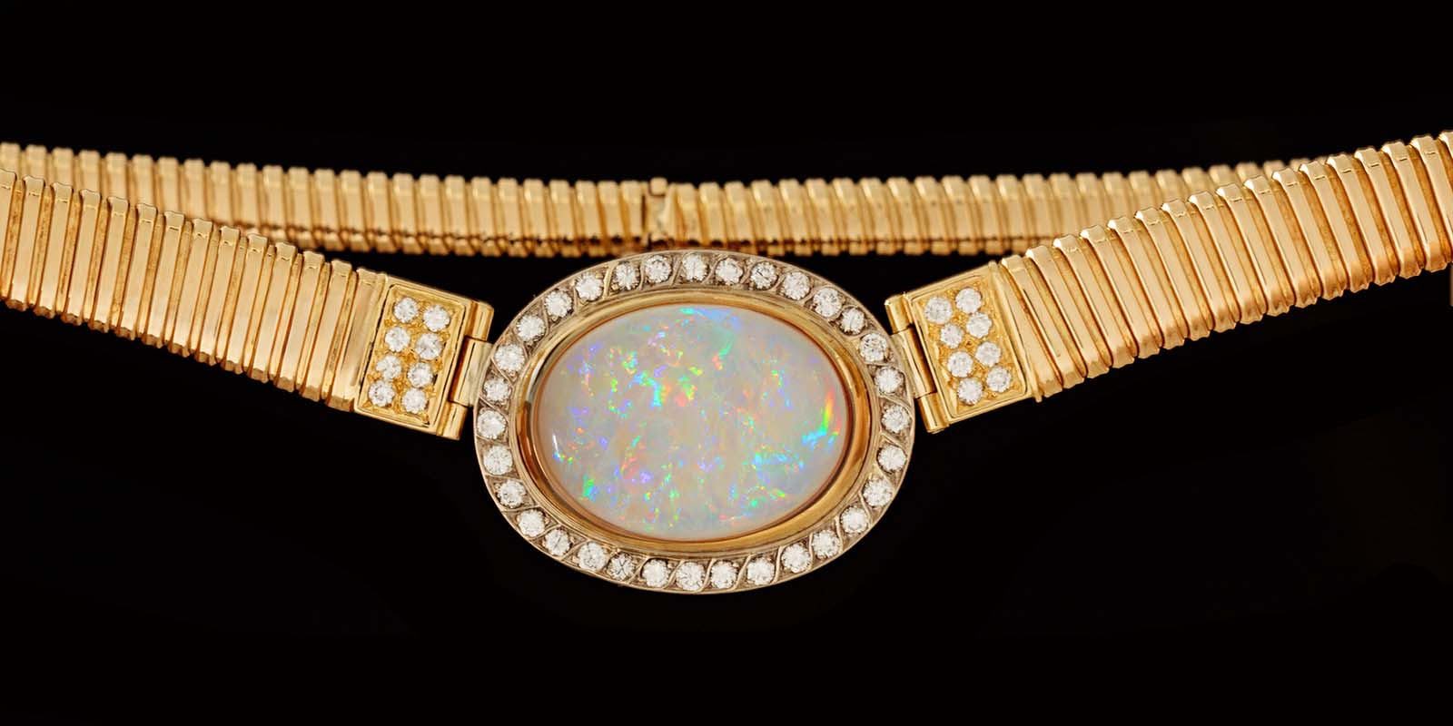 Ein majestätisches Collier aus 750er Gelbgold mit einem prachtvollen Opal und 48 Brillanten