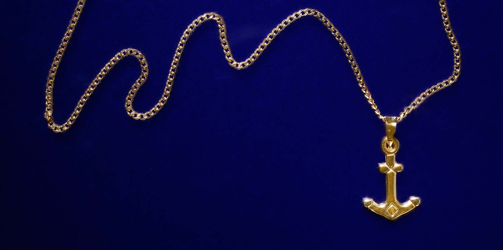 Ein Anker-Anhänger an einer Panzerkette aus 585er Gelbgold