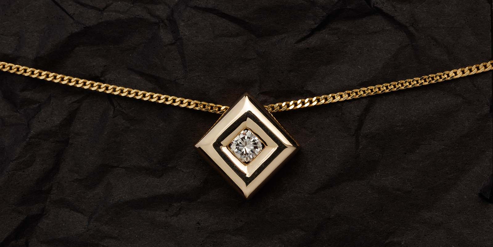 Rautenförmiger Anhänger mit Diamant an einer Panzerkette aus 585er Gelbgold