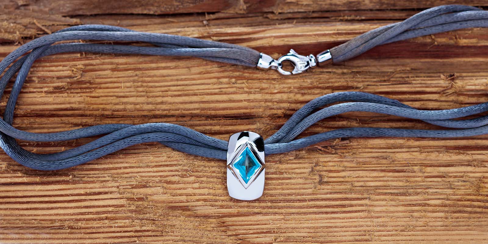 Edle Samtkette von Montblanc mit einem Anhänger aus 750er Weißgold, in dem ein Blautopas im Princess-Schliff ruht