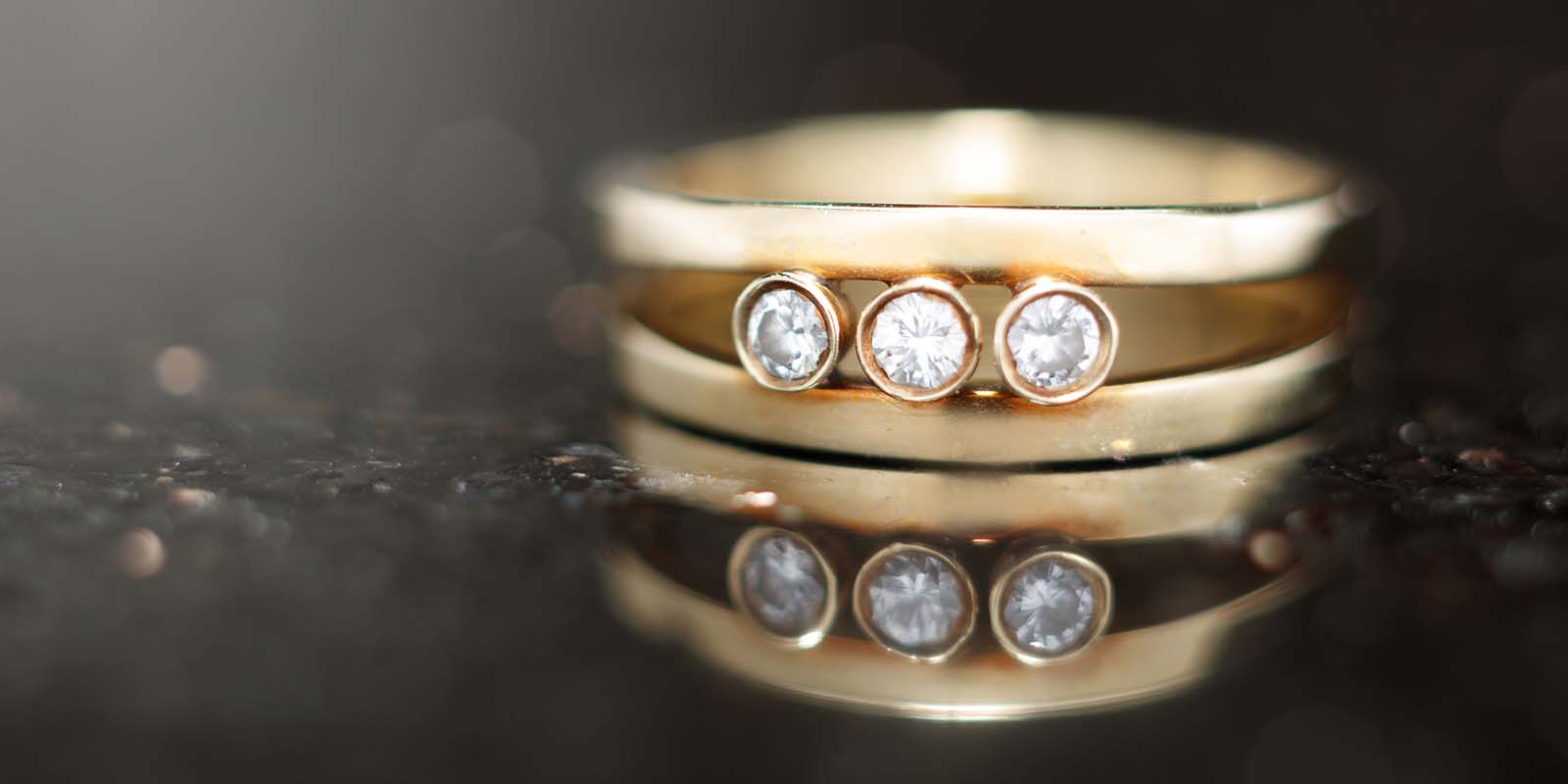 In einer doppelten Ringschiene aus 585er Gelbgold ruhen drei Diamanten