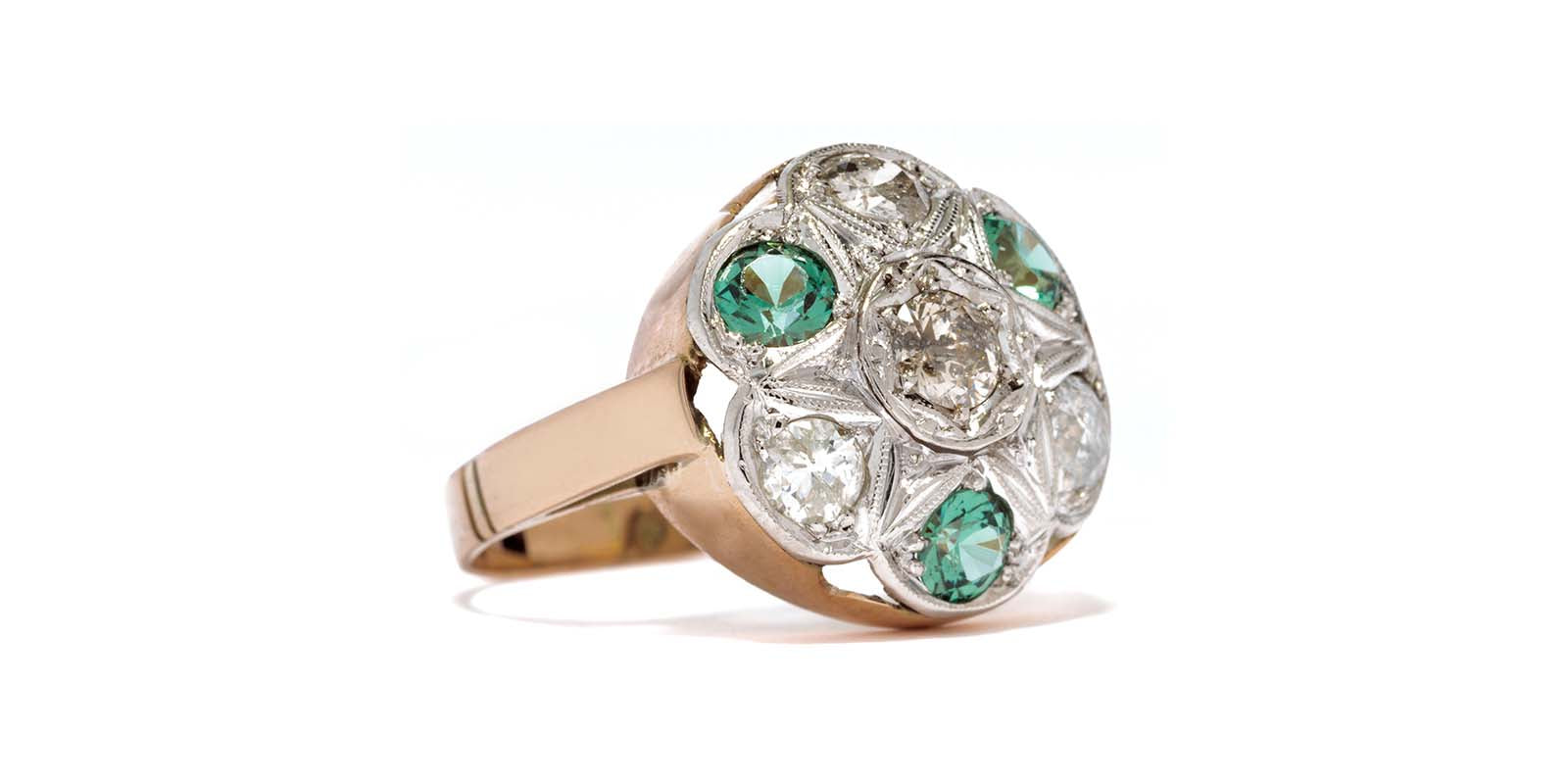 Das zarte Grün dreier Turmaline trifft auf das Funkeln von vier Diamanten auf diesem Ring aus 585er Gelbgold