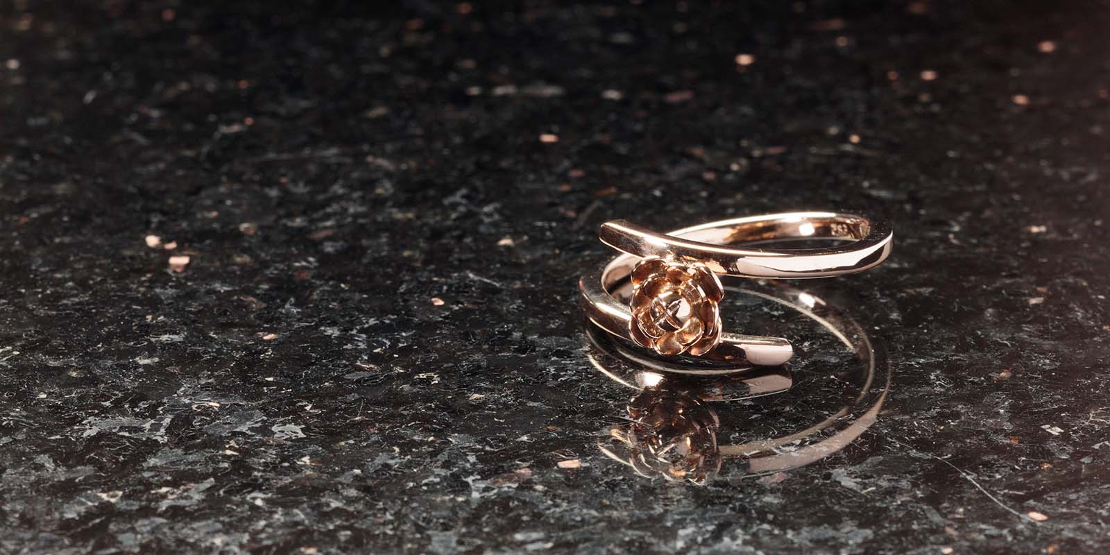 Eine goldene Blume ziert diesen Ring aus 585er Rotgold