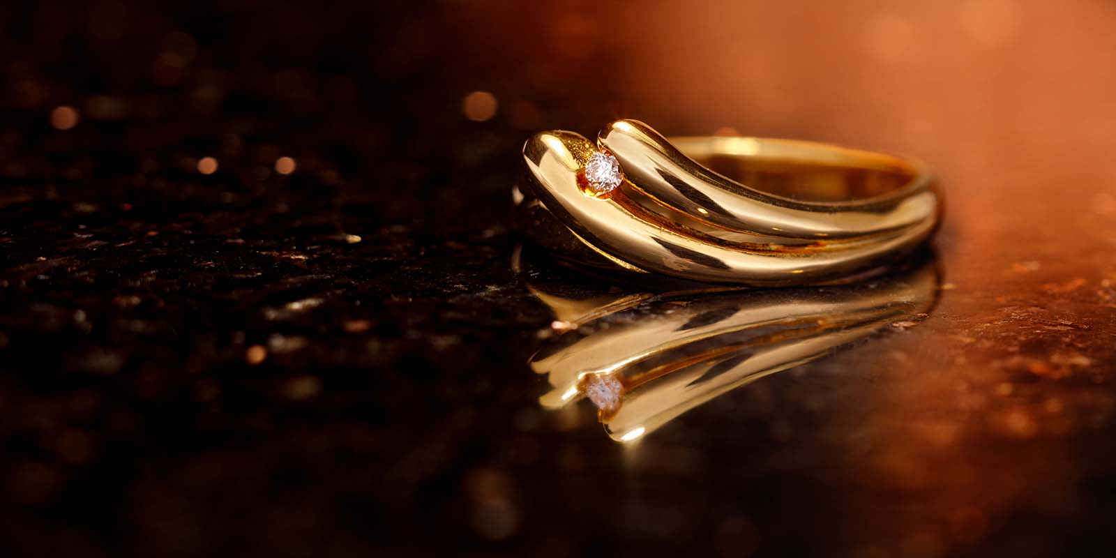 Ein Ring wie eine sanfte Welle aus 750er Gelbgold, auf der ein einzelner Brillant schwimmt