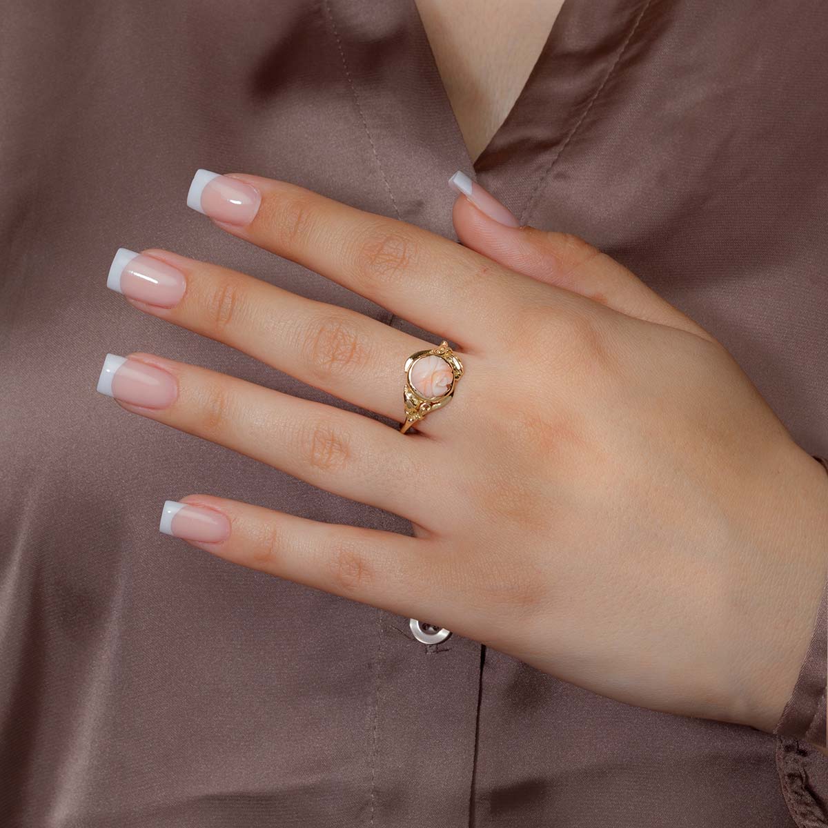 Koralle mit floralem Relief auf einem Ring aus 585er Gelbgold