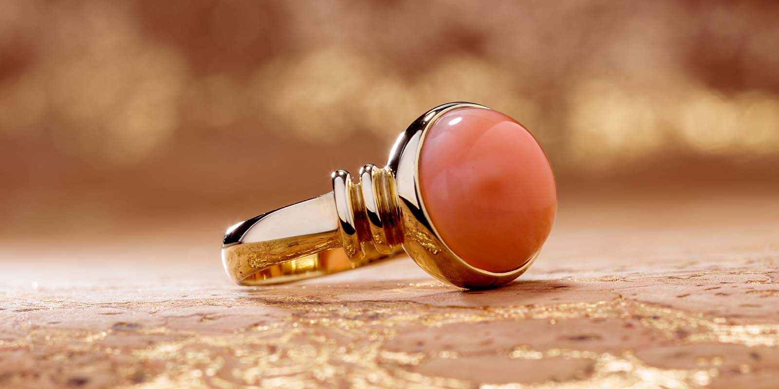 Eine prachtvolle orange Koralle auf einem Ring aus 585er Gelbgold