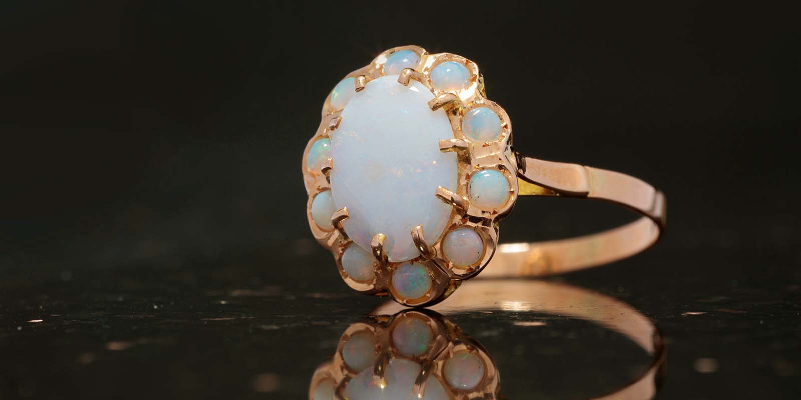 Zehn dieser Edelsteine im Cabochon-Schliff umringen einen großen, ovalen Opal im Zentrum des Ringkopfs. Die Steine können von allen Seiten bestaunt werden, da sie von filigranen Krappenfassungen in der rotgoldenen Ringfarbe gehalten werden. Der Kontrast mit dem 14-karätigen, feurigen Rotgold lässt die Zartheit der weißen Opale umso mehr hervortreten.