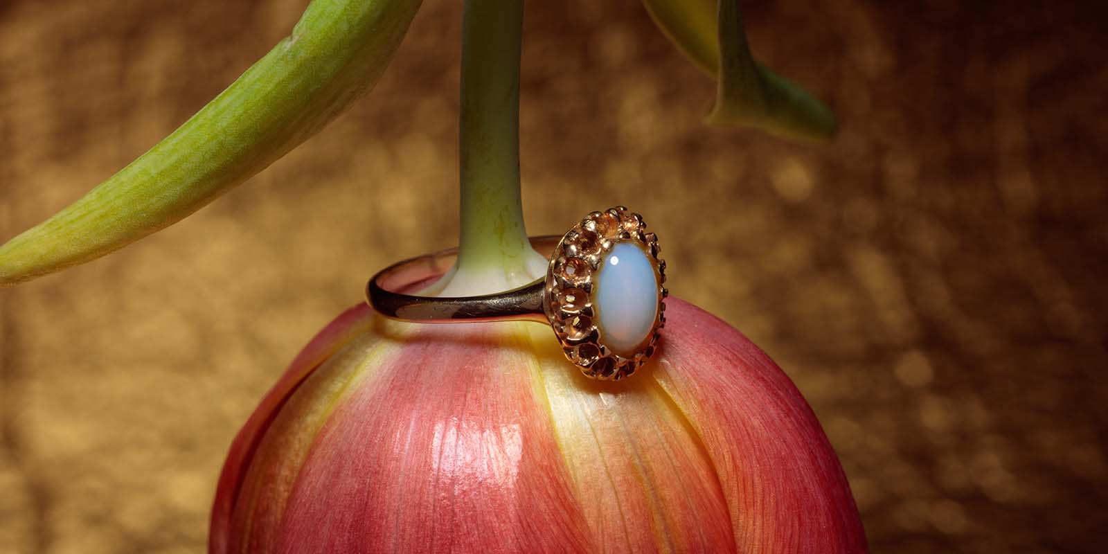 Ein weißer Opal auf einem Ring aus 750er Gelbgold