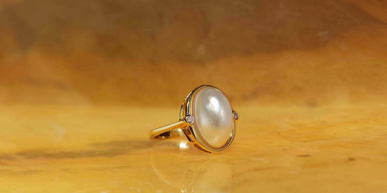 Eine herrliche Mabé-Perle, zusammen mit zwei Diamanten auf einem Ring aus 585er Gelbgold