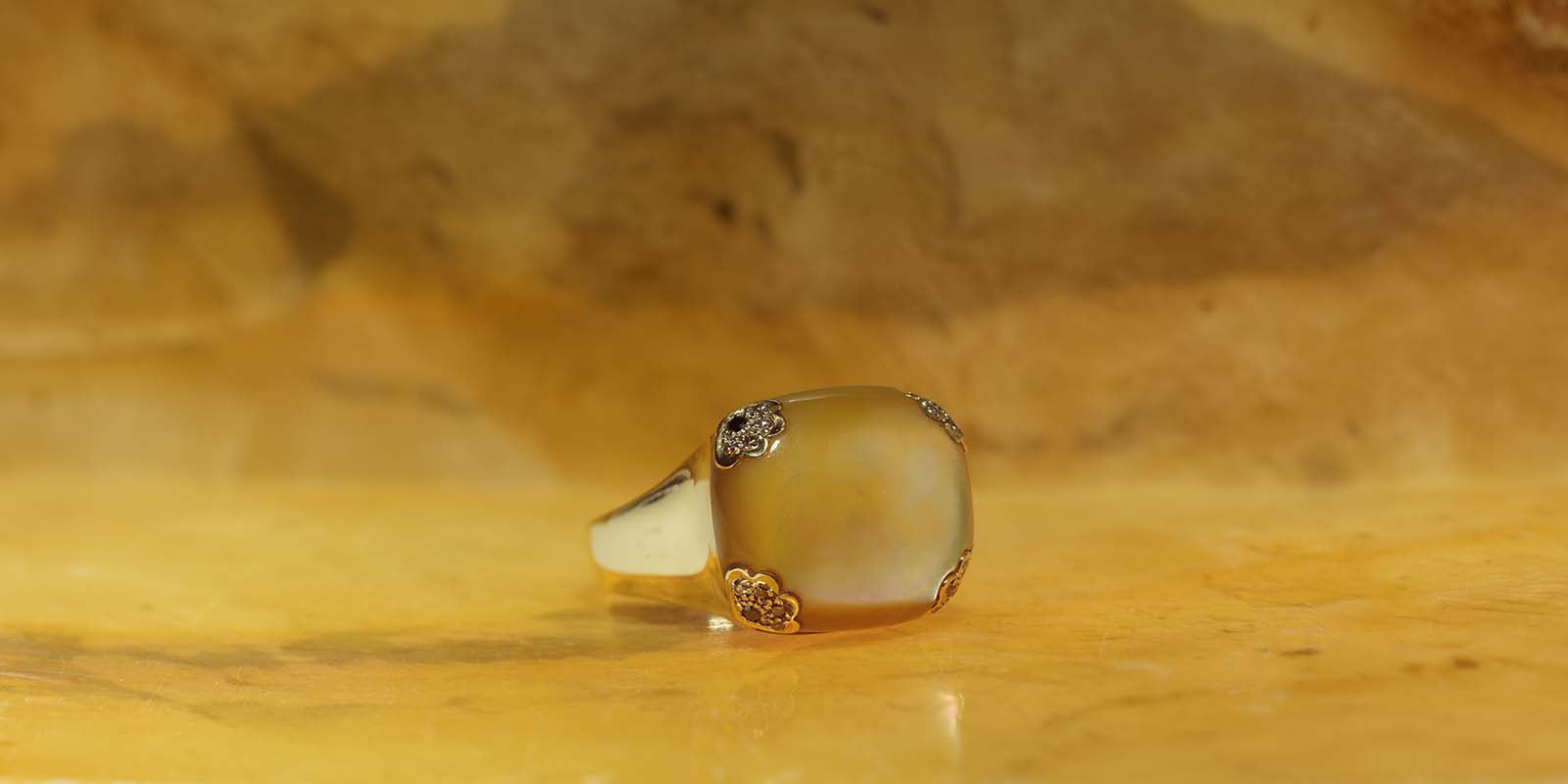 Ein faszinierender Perlmutt-Ring mit 4 Saphiren und 16 Diamanten