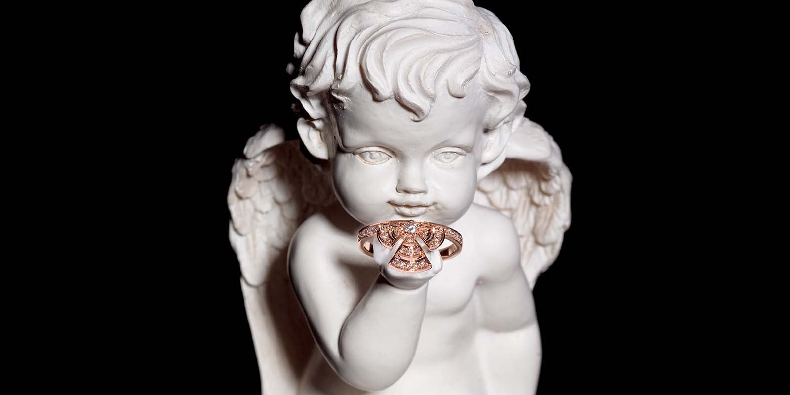 Engelsgleiche Verzierungen auf einem Ring aus 585er Rotgold mit 32 pinken Diamanten