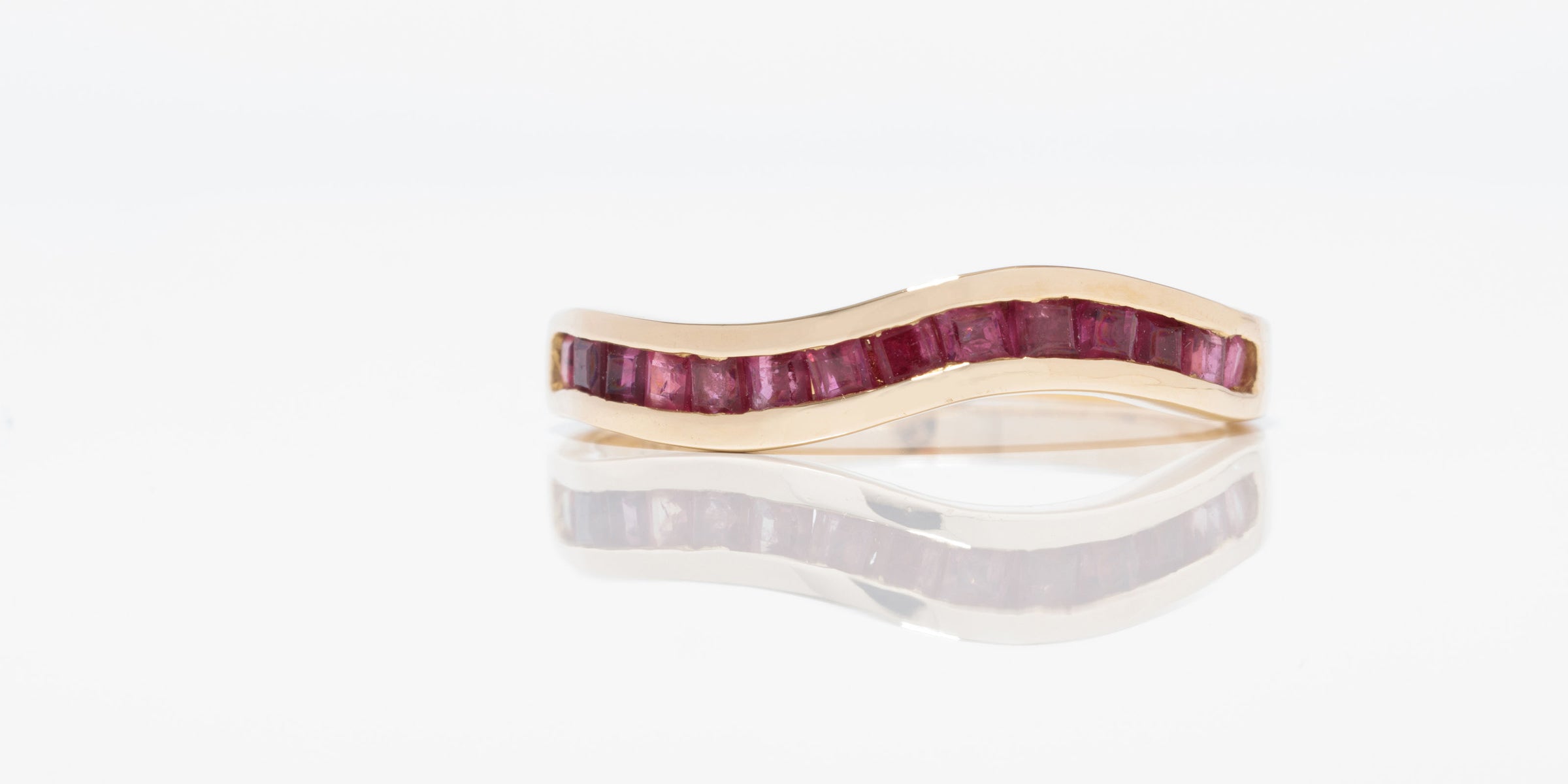 Flammende Rubine in einer Kanalfassung auf einem Ring aus honigfarbenem 585er Gelbgold