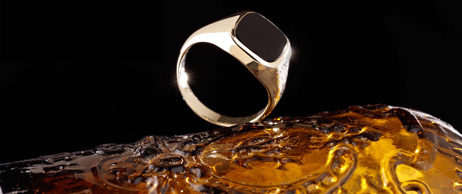 Ein Siegelring aus 585er Gelbgold trägt einen flach geschliffenen Onyx