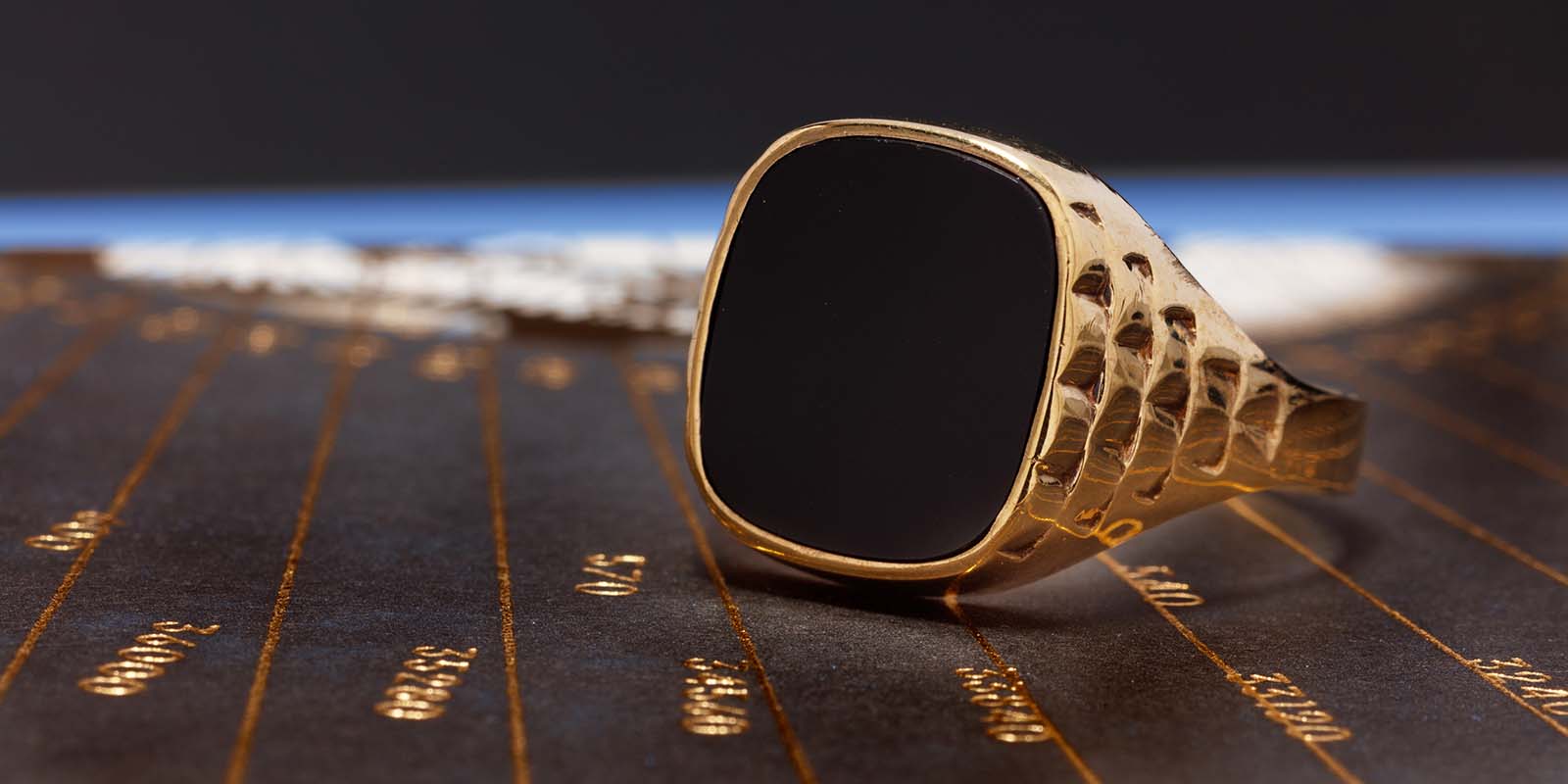 Kontraste aus Schwarz und Gold auf diesem Siegelring aus 585er Gelbgold mit Onyx