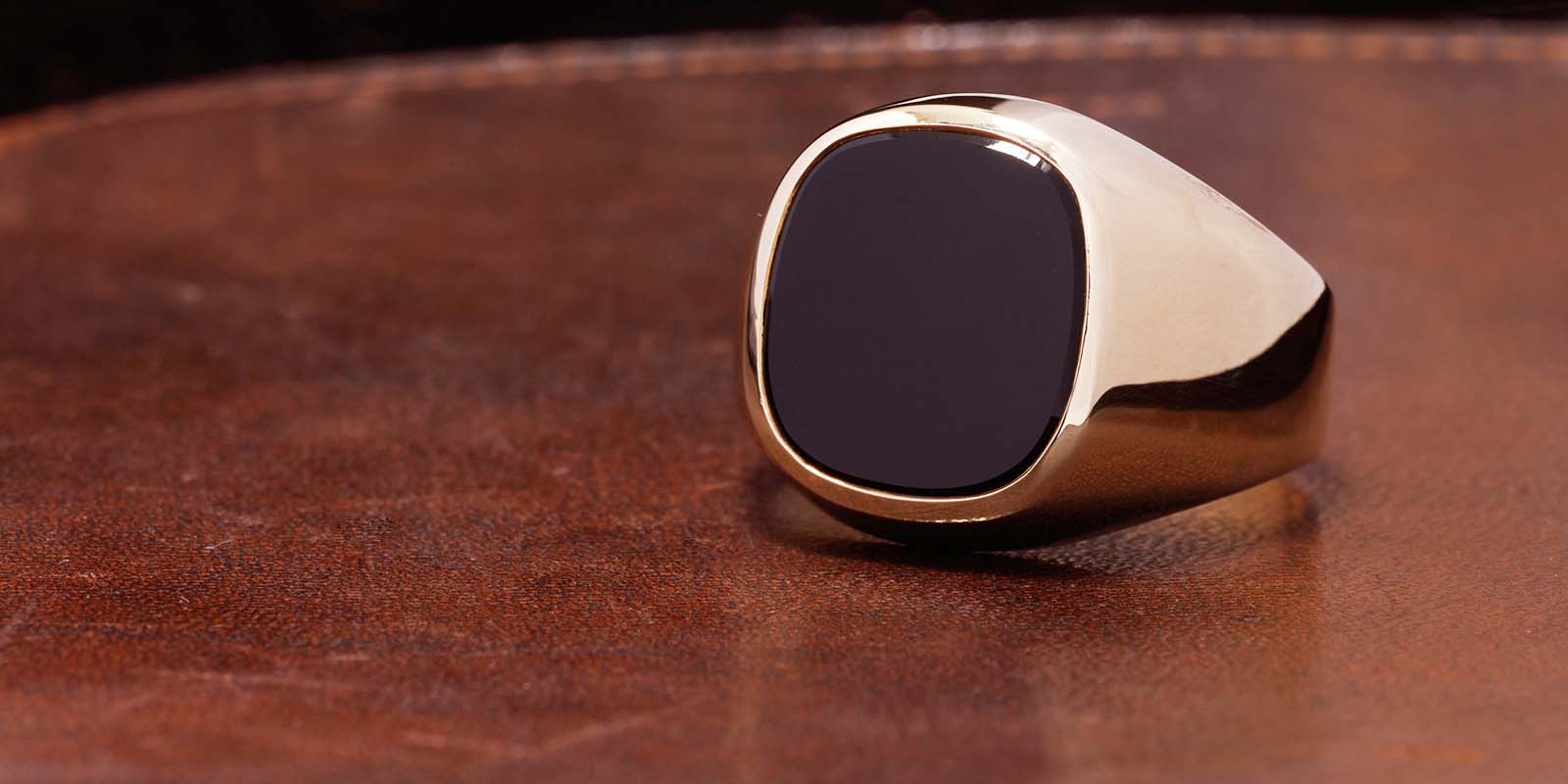 Ein Onyx-Siegelring mit weich fließenden Formen aus 585er Gelbgold