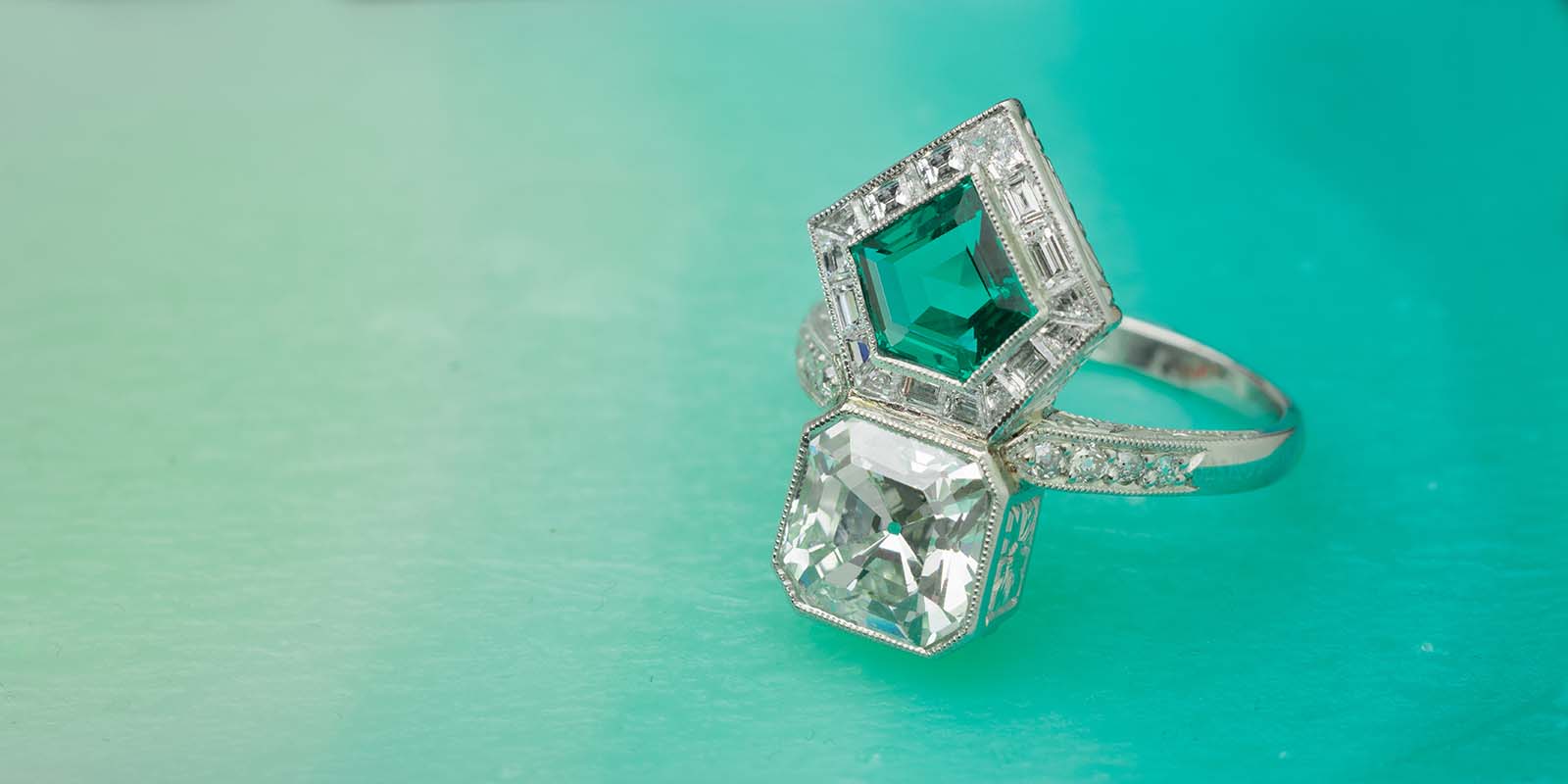 Ein Smaragd und 26 Diamanten auf einen Ring aus 950er Platin gefasst