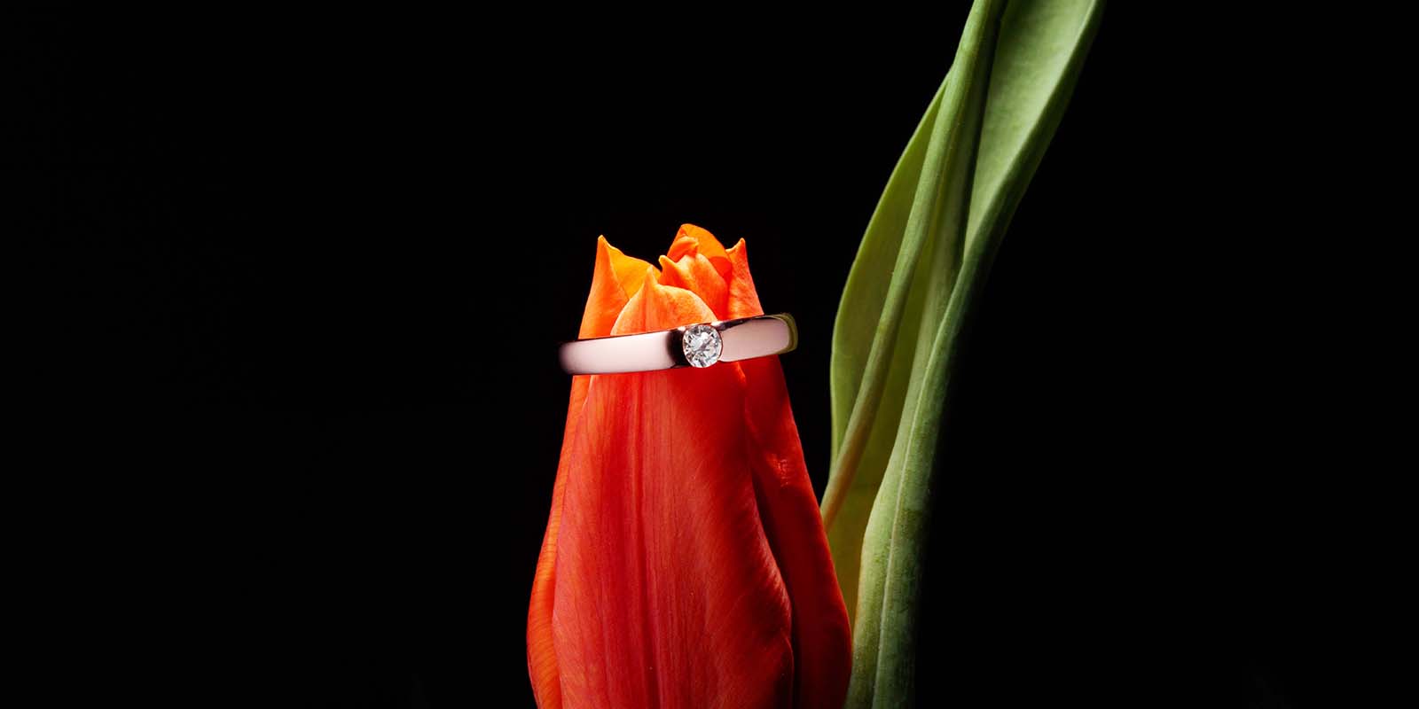 Ein funkelnder Diamant im halboffenen Spannring aus 585er Rotgold