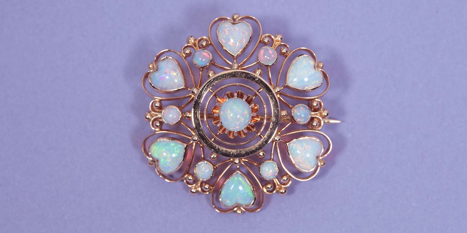 13 Opale sind auf einer Brosche aus 585er Rotgold zu einer hinreißenden Blütenform arrangiert