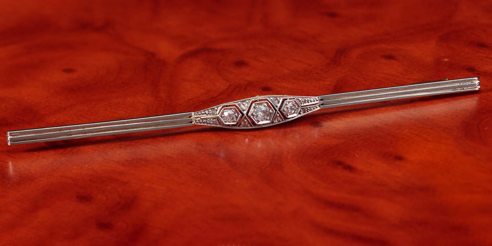 Eine platinierte, diamantbesetzte Art-déco-Stabbrosche aus 585er Gelbgold